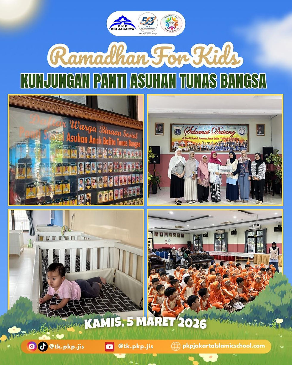 Dalam rangkaian kegiatan Ramadhan For Kids 1447 H, KB-TK PKP Jakarta Islamic School (JIS) menyelenggarakan kegiatan penuh makna berupa kunjungan ke Panti Asuhan Tunas Bangsa pada tanggal 5–6 Maret 2026.